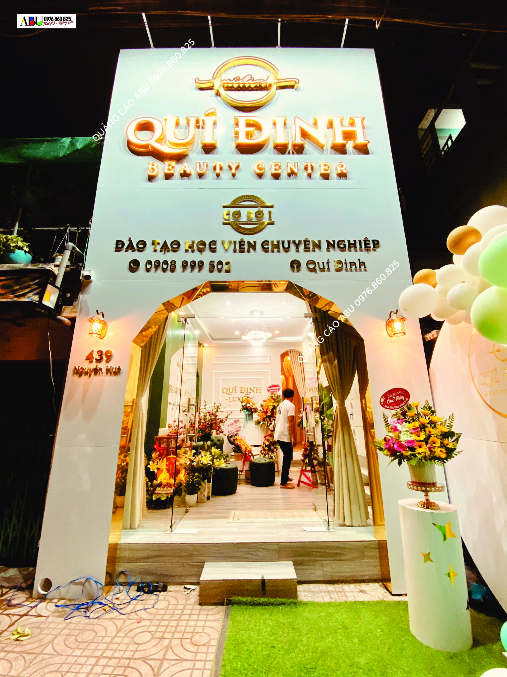 Mặt dựng Alu trắng bóng, kết hợp cùng chữ nổi Full Inox vàng 304 cao cấp